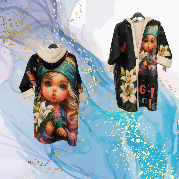 El estampado “Baby” muestra una preciosa muñequita de grandes ojos, flores blancas y tonos suaves sobre fondo oscuro, creando un efecto encantador y femenino.