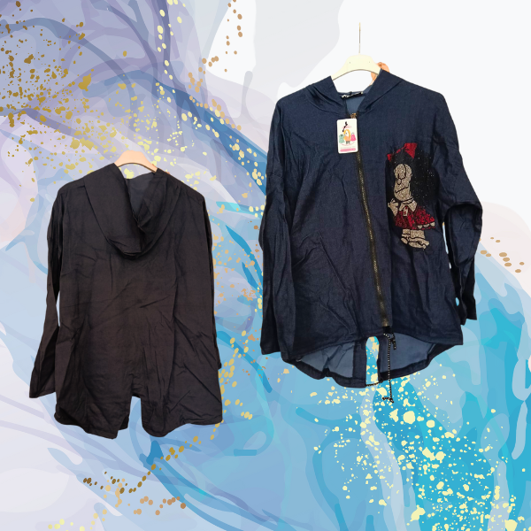 Medidas de esta chaqueta símil denim elástico (95% poliéster, 5% elastan), con capucha, cremallera central, más larga en espalda, bolsillos laterales: