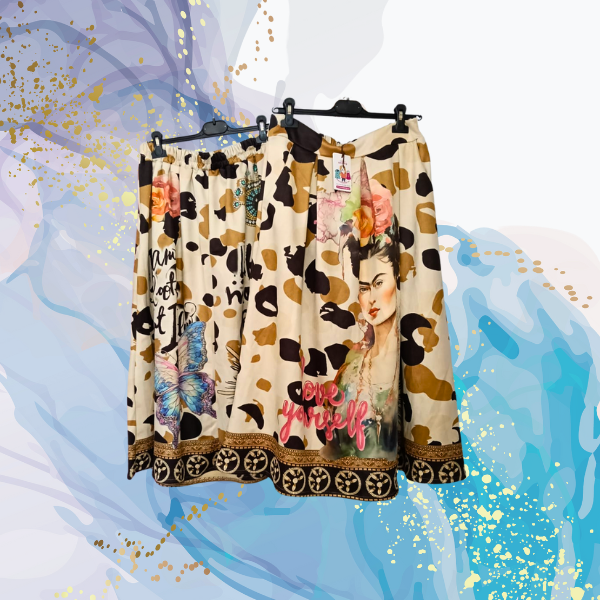 Nuestra falda de antelina con vuelo y bolsillos Frida Love Yourself celebra la fuerza, el arte y la autenticidad de Frida Kahlo. Con un estampado espectacular lleno de flores, mariposas y mensajes positivos, esta falda es pura inspiración (y comodidad).