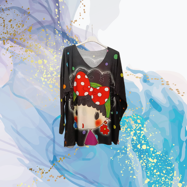 Jersey curvy Muñeca Lazo Rojo, si buscas un jersey alegre y lleno de color, este modelo Muñeca Lazo Rojo es pura diversión. Su protagonista, con su gran lazo de lunares, pendientes florales y un aire muy kawaii, convierte una prenda cómoda en una pieza con mucha personalidad. El fondo oscuro con lunares multicolor lo hace aún más especial y fácil de combinar.