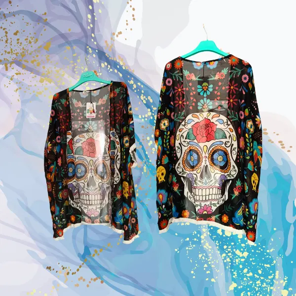 Atrévete con la magia del color y la fuerza de lo simbólico. Este kimono corto de gasa es una auténtica obra de arte: sobre fondo negro translúcido destaca una impresionante calavera tipo catrina, rodeada de flores en colores vibrantes que rinden homenaje a la vida, la cultura y la belleza femenina.