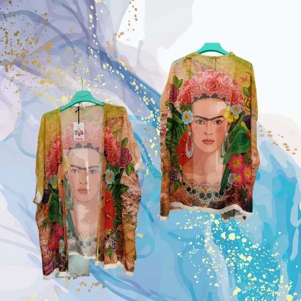 Este kimono corto de gasa es un homenaje a la fuerza y está protagonizado por el icónico rostro de Frida Kahlo rodeado de flores, hojas tropicales y colores vibrantes que inundan la prenda de energía y belleza.