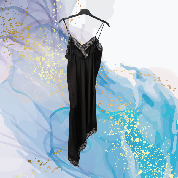 El vestido lencero asimétrico negro es una de esas prendas que se adaptan a ti y al momento.