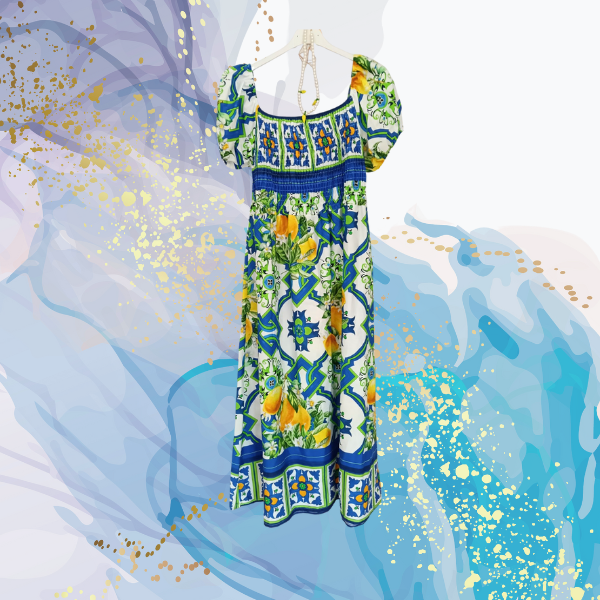 Fresco, alegre y con ese encanto italiano que lo hace irresistible. Este vestido de algodón 100% con nido de abeja en el pecho y manguita globo es todo lo que necesitas para sentirte de vacaciones sin salir de casa. Su estampado de limones y cerámica azul recuerda a las baldosas tradicionales del sur de Italia y despierta todas las ganas de verano.