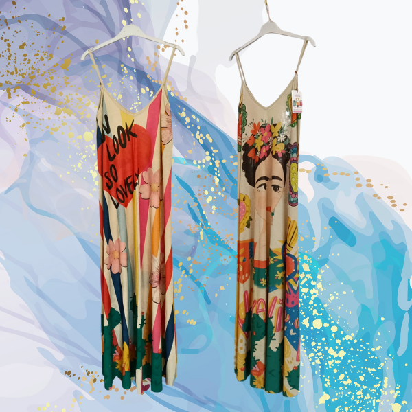 Frida, flores, arte y mensaje. Este vestido largo en tejido lurex es un canto al color, la fuerza femenina y la libertad de estilo.